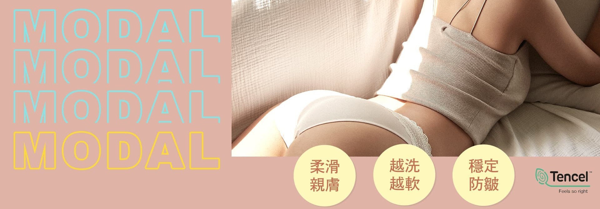 天絲莫代爾取用天然櫸木,採取環保整合式木漿到纖維工藝,舒適柔軟、透氣乾爽、吸濕排汗、像蠶絲般超柔滑,可有效地解決穿著內褲時的各種疑難雜症。