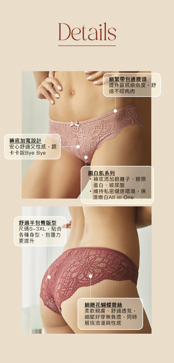柔軟蕾絲半包版型更包覆,褲底改版加寬不卡卡