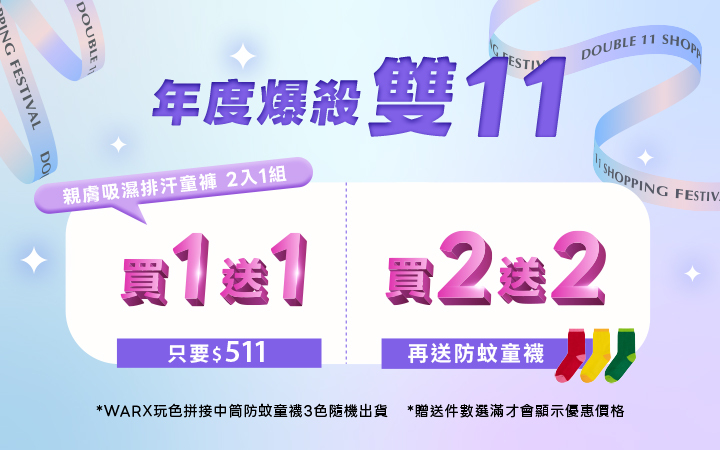 至2025-11-27T02:00:00.000+00:00截止 指定商品,⚡️爆殺雙11⚡️親膚涼感童褲✨買1送1✨(贈送件數選滿才會顯示優惠價格)